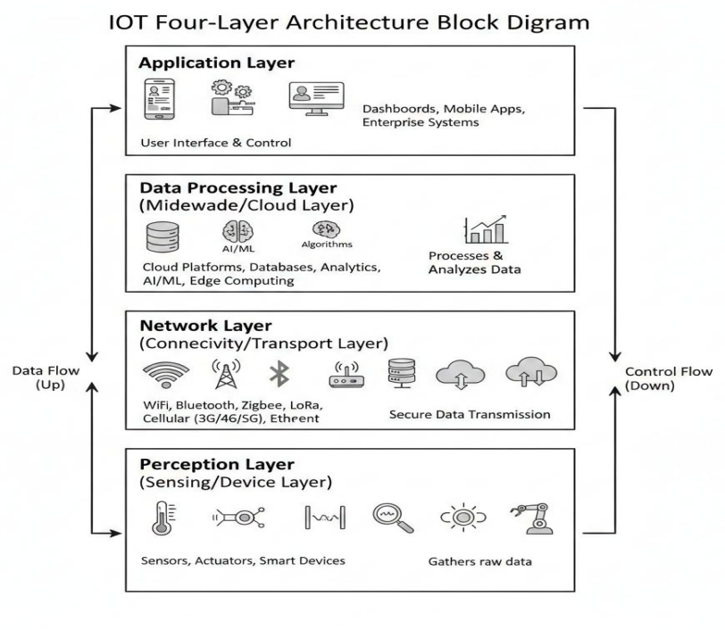 - Finally, the Application Layer at the top display's user interface elements like dashboards and mobile devices for human interaction. Arrows on the sides clarify the process, showing data flowing upward for analysis and control commands flowing downward for device execution.