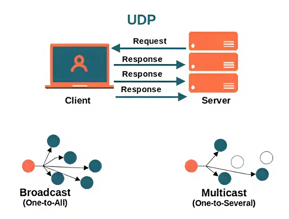 - No Reliability: Does not guarantee delivery, order, or error checking. Packets may be lost or received out of order.