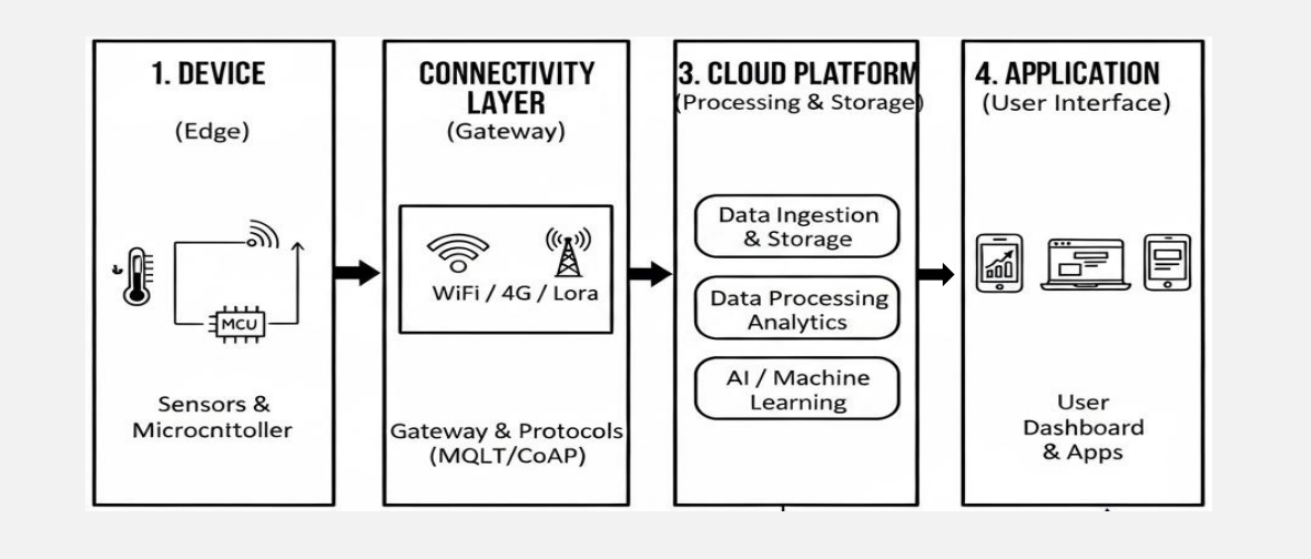 - This layer stores, processes, and analyzes large volumes of raw sensor data. It applies algorithms, analytics, and AI models to identify trends and generate actionable insights. The processed data supports decision-making and automation.